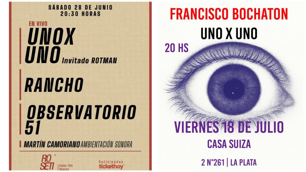 - Viernes 18 de julio | 21:00 horas: Casa Suiza (Calle 2 N° 261, La Plata). UnoxUno junto a Francisco Bochatón. Entradas a la venta acá.