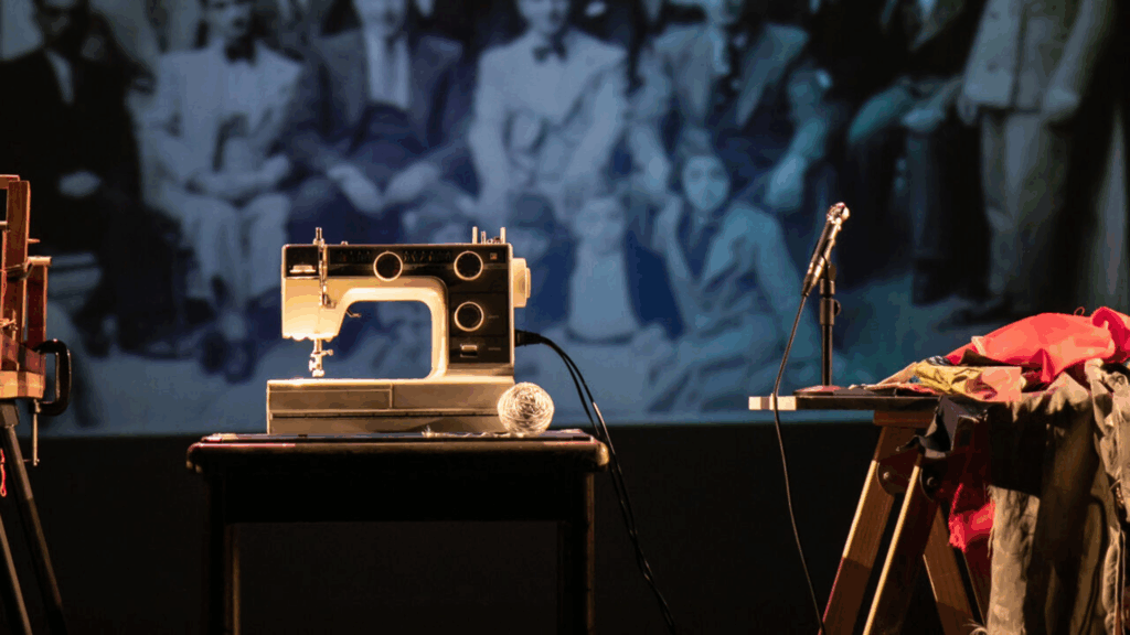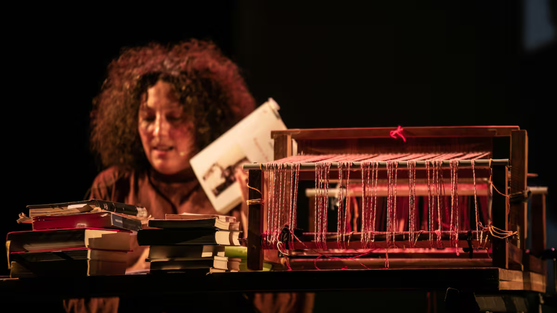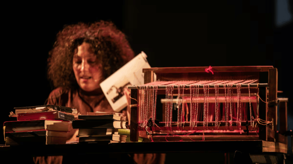 Al entrar en la sala, ambas están sentadas, cada una en una mesa de trabajo que anticipa el rol que van a desempeñar en escena. En la mesa de Edul hay papeles, una computadora y muchos libros. Cada vez que haya una cita en el texto -que compone el cuerpo del espectáculo-, Cynthia la lee directamente del libro y así evidencia el intertexto, los libros se entretejen. Entre ellos aparece una cita de Virginia Postrel que inspira el viaje desde el drama familiar al recorrido universal: “La historia de los textiles es la historia de la inventiva humana”.