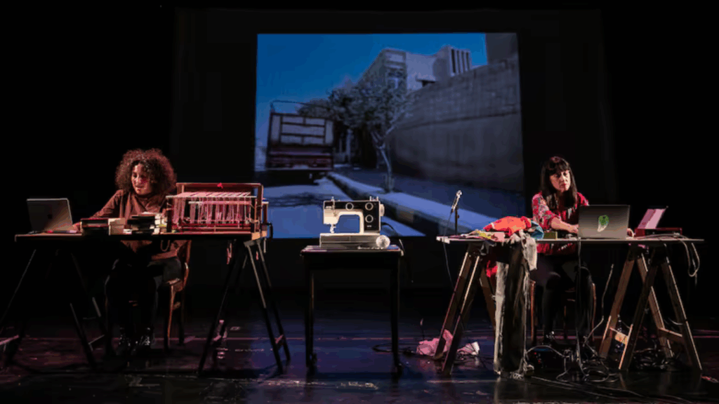 El punto de costura sostiene un diálogo explícito con Imprenteros, obra escrita y dirigida por Lorena Vega que ha recorrido decenas de escenarios y festivales desde su estreno en 2018. La obra de Lorena trabaja a partir del drama autobiográfico y trae a sus propios hermanos al escenario. Por su parte, Cynthia escribe un ensayo literario que luego recita en su propia voz. La música de Etkin es fundamental en este procedimiento. Guillermina trabaja con la memoria auditiva: la introducción se construye con una secuencia de todos los sonidos que puede hacer una tela al tacto, al tensarla, al rasgarla. Una máquina de coser divide los espacios de ambas artistas, pero a la vez las conecta. Una máquina de coser tiene un elemento fundamental común con un piano: el pedal, que también se va a incorporar en el diseño de sonido.