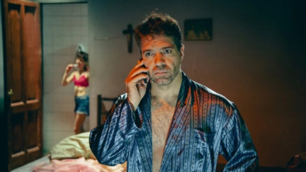 La acción transcurre casi por completo en una habitación de hospedaje austera: una cama doble, una cruz colgada en la pared, una televisión encendida que proyecta imágenes de saqueos. Allí llegan Marcia (Manuela Fernández), una actriz televisiva, y su esposo Marcos (Lucas Delgado), luego de que su auto los deje tirados en la ruta. La primera aparición de Nelson (Damián Smajo), el dueño y encargado del hospedaje, introduce un clima ambiguo que se mantendrá durante toda la obra: su amabilidad resulta intrusiva y su hospitalidad, una forma de vigilancia. Nelson enseguida reconoce a Marcia como una figura famosa y, lejos de retirarse, se instala como una presencia constante en que ciertas veces es percibida como molesta, y otras, convenientes.