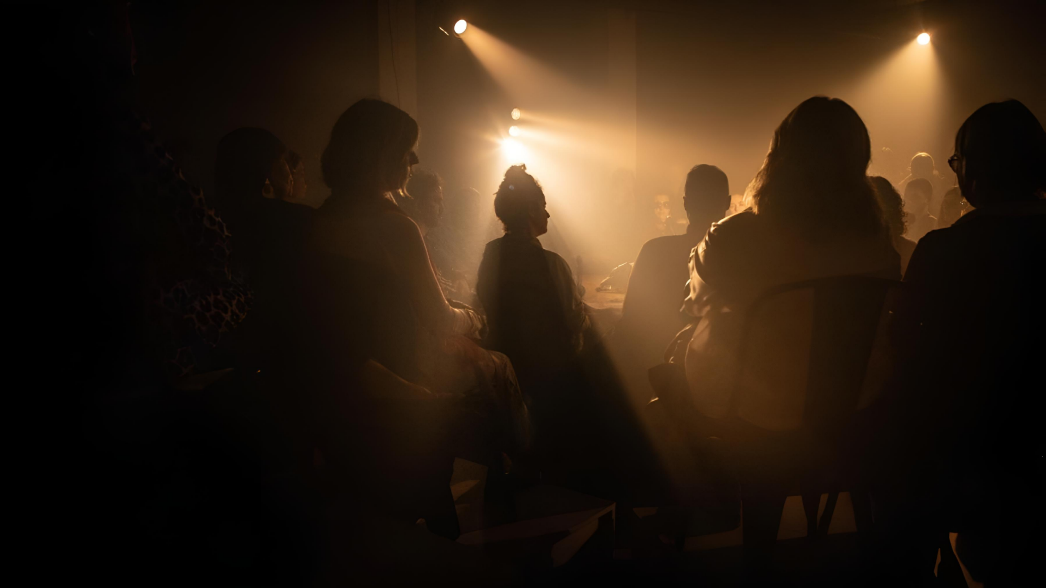 Las actrices se sientan alrededor de una mesa que hace las veces de escenografía, cada una con su micrófono. Los espectadores se ubican en una extrema cercanía, como si la intención fuera cercar el espacio escénico y ser partícipes de la encerrona de los personajes.
