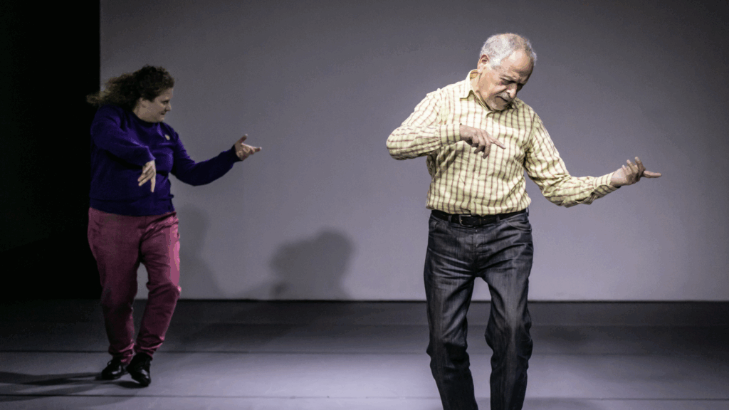 Lucas transmite a Susana, su mamá, la experiencia de habitar su cuerpo. Señala puntos, lugares precisos que roza suavemente con sus dedos y abre caminos internos que se proyectan en distintas direcciones. Ella se presta a ser guiada por sus manos, las mismas que hace tiempo tomó para cuidar al niño. La danza despliega el toque como memoria viva, como reinvención del vínculo primordial donde partir y retornar se confunden entre sí. Natalia y Luis, su papá, retienen la posibilidad del abrazo para prolongarlo indefinidamente. Conocemos los “dos abrazos”: el tierno de la infancia y el que provoca el deseo en los amantes, “en el que el adulto se sobreimprime al niño”1