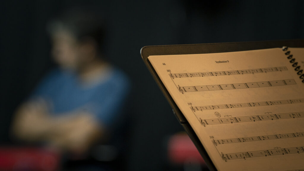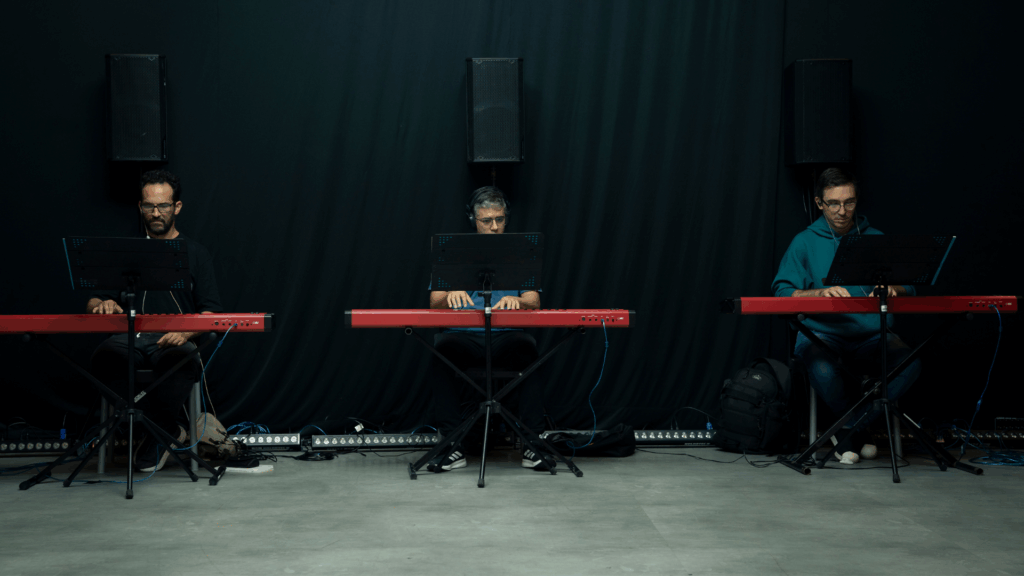 LF: Hay temperamentos microtonales que se modifican a lo largo de la pieza. Cada preset tiene un temperamento específico. De pronto toca un Do y suena un Do, pero tocás en Mib y te da un Do ¼ más arriba. un cuarto más arriba. Hay todo un juego de desplazamientos microtonales y rítmicos constantes. Es una pieza que está escrita de una manera muy compleja. No suena a la pieza más difícil del mundo. Pero métricamente y rítmicamente es compleja sobre todo porque tampoco hay un director frontal. Lo que está escrito es una cantidad de contratiempos, desplazamientos, variaciones motivicas, armonías, etcétera, que se van construyendo dentro de movimientos métricos muy exigentes. Y a la vez están subdivididos rítmicamente al interior. Hay figuras bastante complejas. Hay toda una dificultad de concentración y mucha exigencia de escucha entre los músicos, particularmente del teclado n°1, el del director, en este caso Pablo. Él dirige desde el teclado y toda vez que sus manos se lo permiten.
