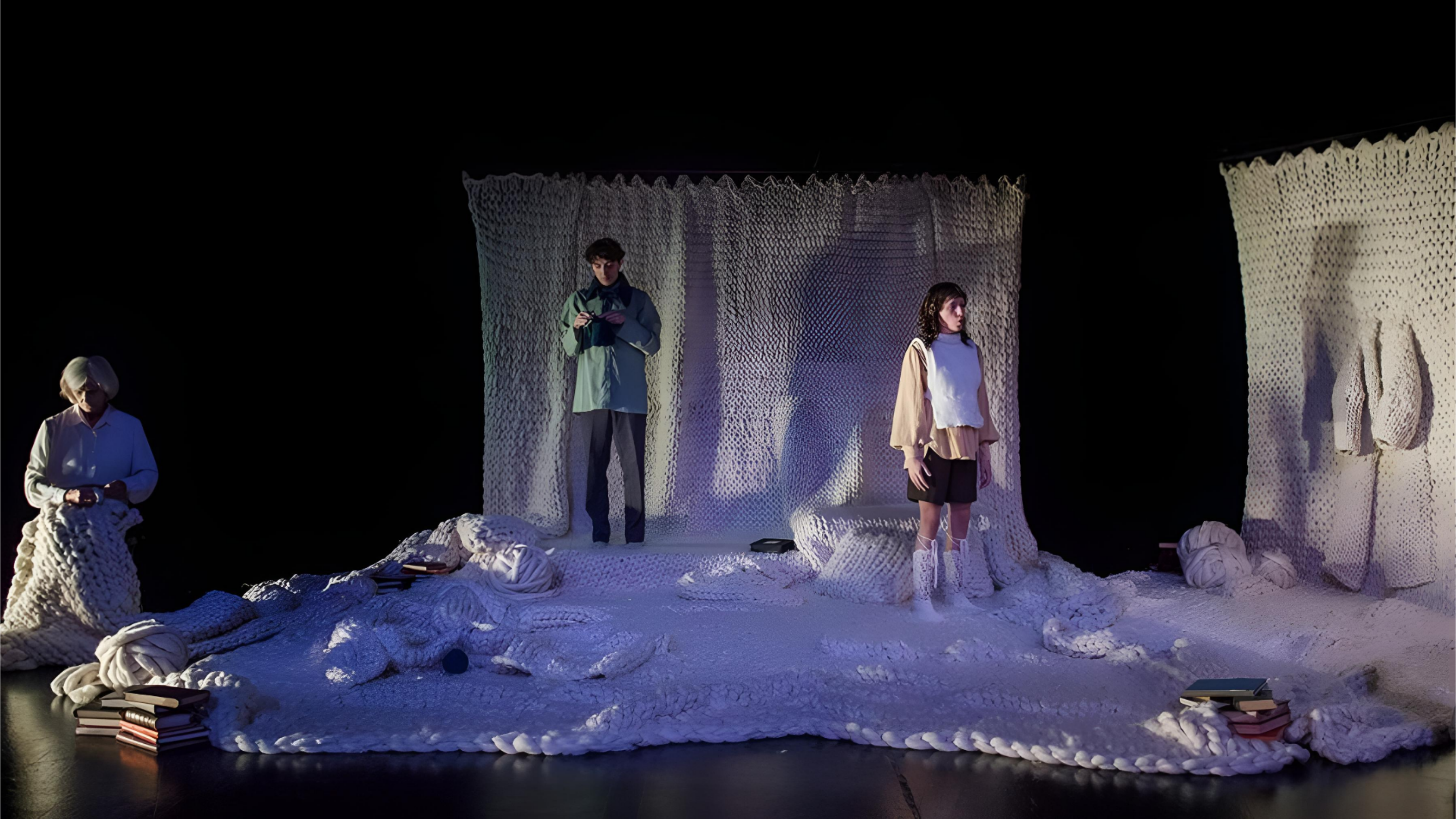 Mientras que en ese interregno las hermanas ensayan fragmentos de textos que intentan anudar el sentido de una vida que se les presenta como incógnita, Fiona, personaje enigmático situado en el límite del espacio escénico, teje con un ovillo de lana que por sus dimensiones señala el tiempo distorsionado de la espera, donde la proximidad de la muerte se vuelve inconmensurable.